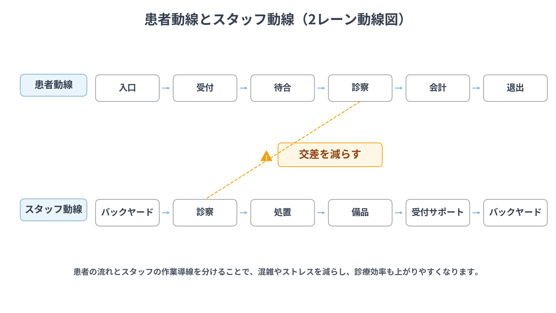患者さん・スタッフ・物品の動きがぶつからないように整理します。